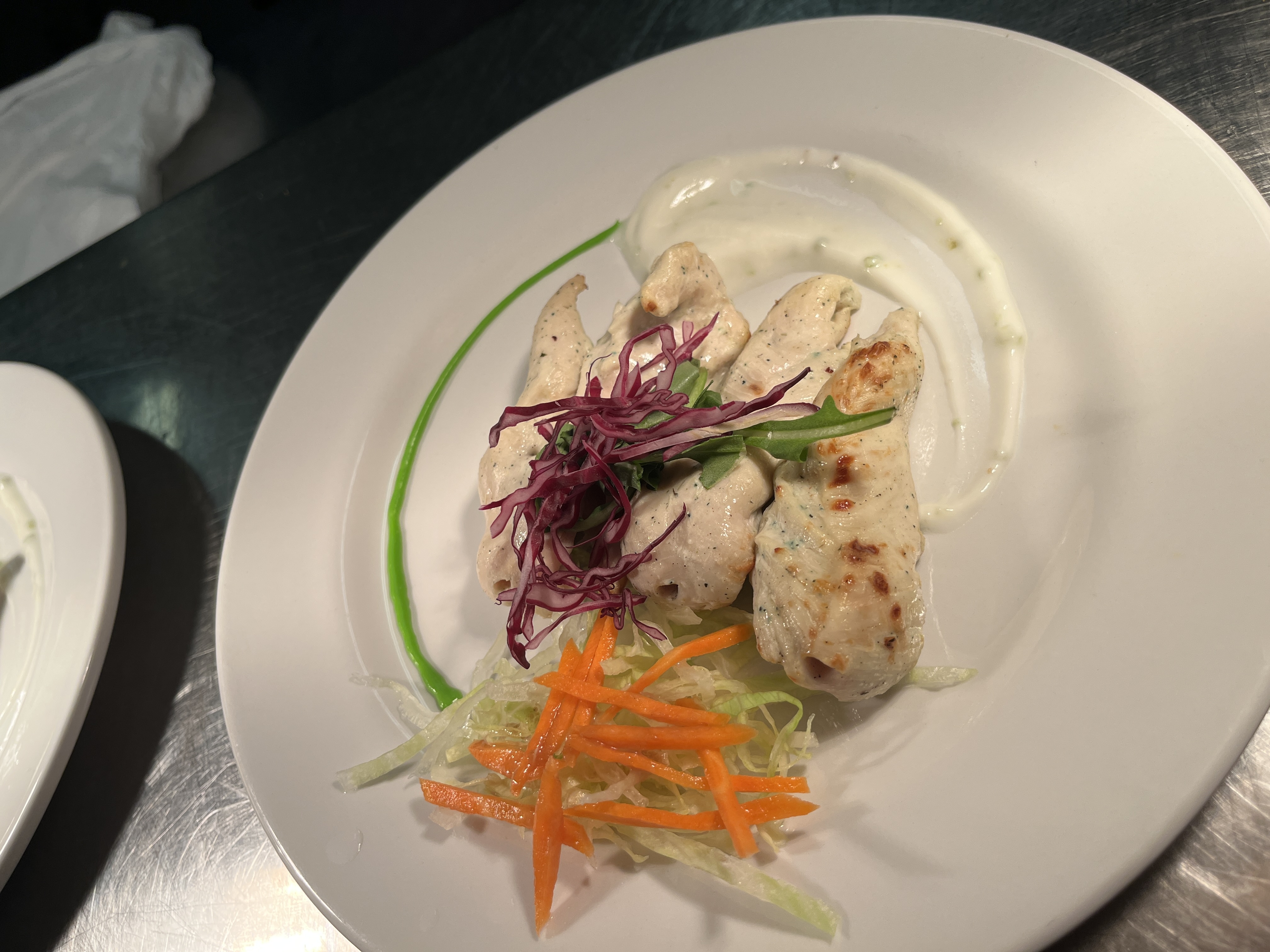 Marinated chicken grilled over high heat, lightly charred and full of smoky flavour. Served with salad and dipping sauce.